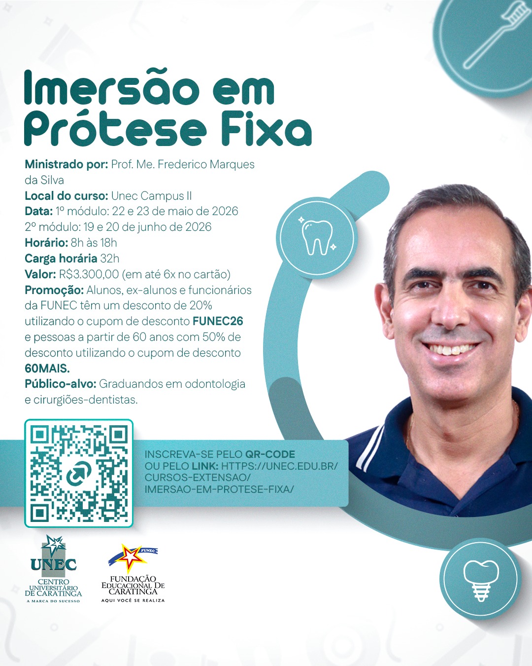 Cirurgião dentista formado pela Univale (GV); especialista em prótese dentária e mestre em clínicas odontológicas (ênfase em prótese dentária).